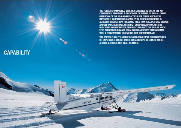 THE PORTER’S UNMATCHED STOL PERFORMANCE IS ONE OF ITS KEY CAPABILITIES, PROVIDING A GREAT DEAL OF FLEXIBILITY AND ALLOWING OPERATION OF THE PC-6 WHERE ACCESS FOR OTHER AIRCRAFT IS IMPOSSIBLE. OUTSTANDING CAPABILITY IN ROUGH CONDITIONS IS ACHIEVED THROUGH LOW-PRESSURE TIRES, TWIN-CALLIPER DISC BRAKES AND AN UNDERCARRIAGE WITH HIGH BUMP ABSORPTION. WITH ITS HIGH WING AND PROPELLER GROUND CLEARANCE, THE PC-6 IS MUCH LESS EXPOSED TO DAMAGE FROM ROUGH AIRSTRIPS THAN AIRCRAFT WITH A CONVENTIONAL NOSEWHEEL-TYPE UNDERCARRIAGE. |