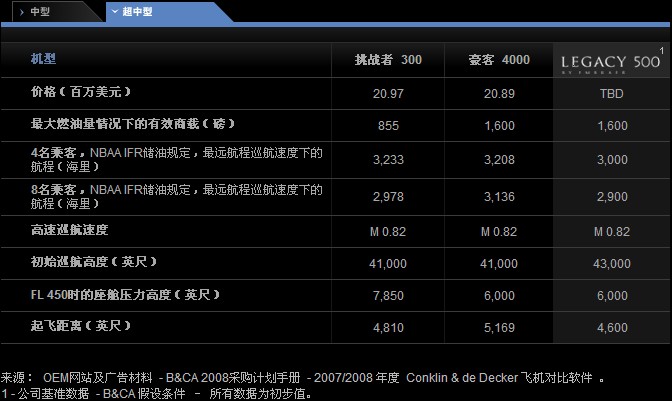 萊格賽500和挑戰(zhàn)者300以及豪客4000比較 |