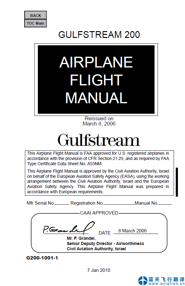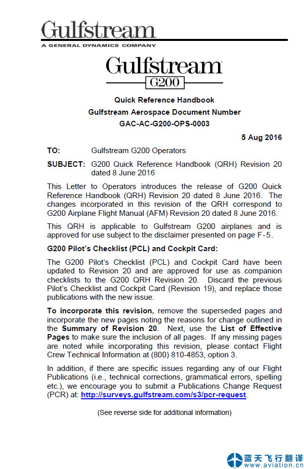 藍(lán)天飛行翻譯公司完成公務(wù)機(jī)公司的灣流G200飛機(jī)飛行手冊和快速檢查單翻譯任務(wù) GULFSTREAM 200 AIRPLANE FLIGHT MANUAL and Quick Reference Handbook Translation ![]() 灣流G200飛機(jī)飛行手冊 GULFSTREAM 200 AIRPLANE FLIGHT MANUAL ![]() 灣流G200快速檢查單 GULFSTREAM 200 Quick Reference Handbook 灣流G200飛機(jī)飛行手冊(GULFSTREAM 200 AIRPLANE FLIGHT MANUAL)的主要內(nèi)容包含有: G200 AFM Introduction Copyright & License INTRODUCTION GENERAL REVISIONS SUPPLEMENTS DEFINITIONS LIMITATIONS EMERGENCY PROCEDURES ABNORMAL PROCEDURES NORMAL PROCEDURES SUPPLEMENTS COMPATIBILITY LOG OF MODIFICATIONS LOG OF REVISIONS LOG OF TEMPORARY REVISIONS LOG OF EFFECTIVE PAGES Limitations LIST OF FIGURES CERTIFICATE LIMITATIONS KINDS OF OPERATIONS REDUCED VERTICAL SEPARATION MINIMUMS (RVSM) MINIMUM FLIGHT CREW WEIGHT LIMITATIONS MAXIMUM CERTIFICATED WEIGHTS (LB/KG) MINIMUM FLIGHT WEIGHT (LB/KG) BAGGAGE COMPARTMENT WEIGHT AND LOADING CENTER-OF-GRAVITY LIMITATIONS Center-of-Gravity Envelope POWERPLANT LIMITATIONS APPROVED OILS APPROVED FUELS FUEL SYSTEM LIMITATIONS FUEL TANKS CAPACITY FUEL TANK TEMPERATURE LIMITATIONS (indicated) FUEL UNBALANCE MINIMUM FUEL FOR GO-AROUND Maximum Fuel Tank Temperature Vs. Altitude ENGINE OPERATING LIMITATIONS MAXIMUM RPM, N1 AND N2 MAXIMUM INTERSTAGE TURBINE TEMPERATURE TIME LIMITS OIL PRESSURE (At Normal Operating Temperature) OIL TEMPERATURE AMBIENT TEMPERATURE AND ALTITUDE ENVELOPE APU LIMITATIONS APU Load Limits without Mod 10163 SPEED LIMITATIONS MAXIMUM OPERATION LIMIT SPEED (VMO/MMO) MANEUVERING SPEED (VA) Speed Limitations MAXIMUM SLATS/KRUEGER/FLAPS EXTENSION (VSE/VFE) MAXIMUM LANDING GEAR EXTENSION (VLO/VLE) MAXIMUM LANDING GEAR EXTENDED ALTITUDE MAXIMUM TIRE GROUND SPEED MINIMUM CONTROL SPEED - AIR (VMCA) MINIMUM CONTROL SPEED - GROUND (VMCG) MAXIMUM AIR BRAKES OPERATION/ EXTENDED SPEED MINIMUM FLIGHT SPEED MAXIMUM WINDSHIELD WIPER OPERATING SPEED (PRE-MOD 10141) PROHIBITED MANEUVERS LOAD FACTOR LIMITS MAXIMUM APPROVED OPERATING ALTITUDE OPERATING TEMPERATURE/ALTITUDE LIMITATIONS OPERATING TEMPERATURE/ALTITUDE LIMITATIONS RUNWAY SLOPE LIMITATIONS (TAKE-OFF ONLY) MAXIMUM TAILWIND COMPONENTS APPROVED RUNWAY SURFACE TYPE HYDRAULIC SYSTEM LIMITATIONS APPROVED HYDRAULIC FLUIDS HYDRAULIC PRESSURE LIMITATIONS HYDRAULIC TEMPERATURE LIMITATIONS THRUST REVERSERS CABIN PRESSURIZATION MAXIMUM CABIN DIFFERENTIAL PRESSURE ANTI-ICE SYSTEM LIMITATIONS GROUND OPERATIONS DE-ICE SYSTEM LIMITATIONS ELECTRICAL SYSTEM LIMITATIONS DC STARTER - GENERATOR LIMITS BATTERY LIMITS HORIZONTAL STABILIZER TRIM OPERATING LIMITATIONS AUTOPILOT LIMITATIONS Yaw Damper ENHANCED SURVEILLANCE FLIGHT IDENTIFICATION (WITH MOD 10154) INSTRUMENT MARKINGS PLACARDS (Pre MOD 03842) PLACARDS (Post MOD 03842) Emergency Procedures LIST OF FIGURES EICAS WARNING MESSAGES EICAS Display - Primary Page GENERAL GUIDANCE Warning Messages ENGINE FIRE OR ENGINE OVER HEAT |
