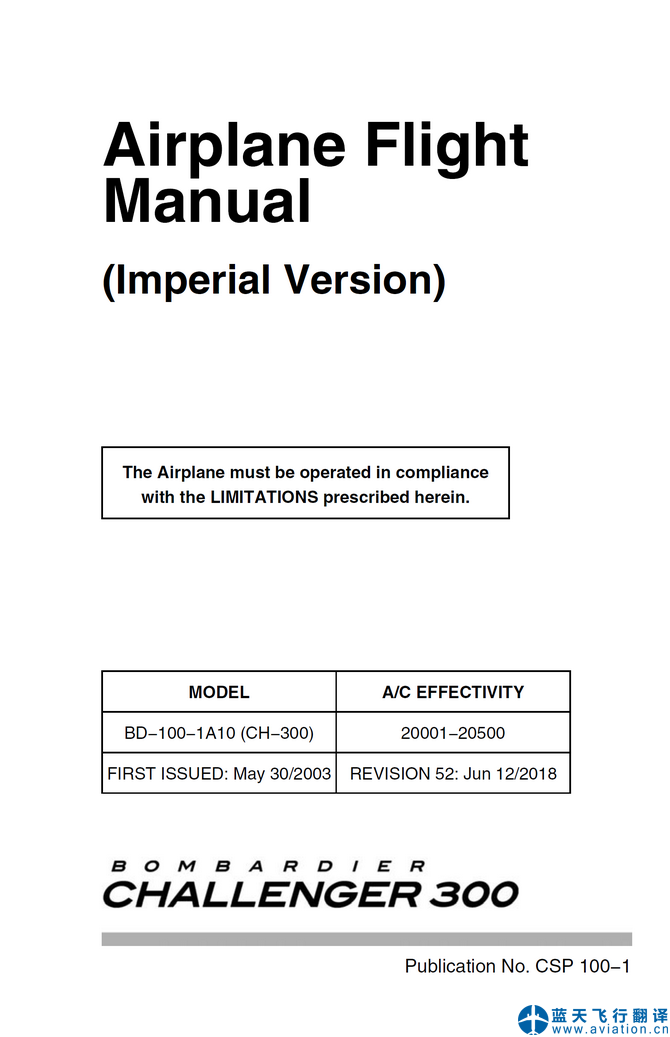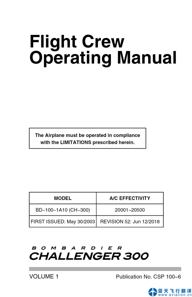 北京藍(lán)天飛行翻譯公司承接公務(wù)機(jī)公司2018年6月12日第52版龐巴迪挑戰(zhàn)者300公務(wù)機(jī)全套飛行手冊翻譯任務(wù) REVISION 52: Jun 12/2018 Bombardier Challenger 300 Flight Crew Operating Manual, Airplane Flight Manual and Quick Reference Handbook Translation ![]() 龐巴迪挑戰(zhàn)者300 Bombardier Challenger 300 本次翻譯的龐巴迪挑戰(zhàn)者300公務(wù)機(jī)飛行手冊包含有: 挑戰(zhàn)者300機(jī)組操作手冊 Challenger 300 Flight Crew Operating Manual 版次為2018年6月12日第52版 挑戰(zhàn)者300飛機(jī)飛行手冊 Challenger 300 Airplane Flight Manual 版次為2018年6月12日第52版 挑戰(zhàn)者300快速檢查單 Challenger 300 Quick Reference Handbook 版次為2018年6月12日第52版 ![]() 挑戰(zhàn)者300 Challenger 300