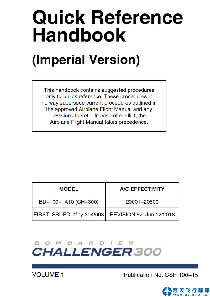 ![]() 挑戰(zhàn)者300機(jī)組操作手冊 Challenger 300 Flight Crew Operating Manual ![]() 挑戰(zhàn)者300飛機(jī)飛行手冊 Challenger 300 Airplane Flight Manual ![]() 挑戰(zhàn)者300快速檢查單 Challenger 300 Quick Reference Handbook