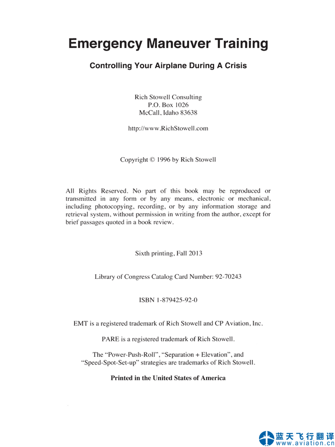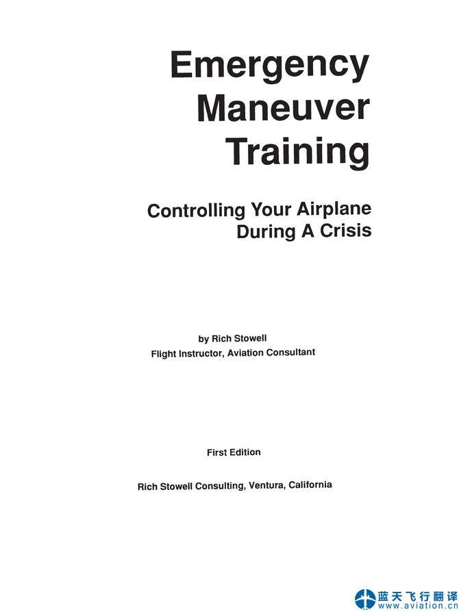 藍(lán)天飛行翻譯公司承接大型航校緊急機(jī)動(dòng)飛行訓(xùn)練手冊(cè)翻譯任務(wù) Emergency Maneuver Training Manual Translation ![]() ![]() 緊急機(jī)動(dòng)飛行訓(xùn)練手冊(cè) Emergency Maneuver Training Manual 緊急機(jī)動(dòng)飛行訓(xùn)練手冊(cè)(Emergency Maneuver Training Manual)的主要內(nèi)容包含有: Emergency Maneuver Training Basic Aerodynamics Steady Flight Important Ratios Roll, Yaw, and Pitch Roll Yaw Pitch Secondary Roll Effects Secondary Yaw Effects Secondary Pitch Effects Pitch and Power Energy Management The Power Curve Curved Flight Forces in Turns G-Loads The V-g Diagram Helpful Hints Shallow Turns Medium Turns Steep Turns Climbing & Descending Turns Skidding Turns Slipping Turns Turn/Roll Combinations Spirals Final Thoughts Stalls Flying the V-g Diagram Aerodynamic Cues Mechanical Cues Physiological Cues Approach-To-Landing Stall Departure Stall Under-The-Bottom Stall Over-The-Top Stall Prolonged Stall Deep Stall Tail Stall Stall Speed vs. C.G. Flaps Final Thoughts Spins Spin Dynamics Incipient Developed Recovery Inertia Effects Wing Design Fuselage Design Tail Design Pilot-Controlled Variables Power Ailerons Flaps Rudder Elevator Procedure vs. Technique Accelerated Spin Transition Spin Cross-Over Spin Pilot-Induced Flat Spin Overbanked Roll Dynamics V-p & V-g Diagrams Power Push Roll Managing The Airspeed In The Pattern Invisible Tornadoes Aircraft Configuration Effects Atmospheric Effects Separation Elevation Be Prepared Control Failures Ailerons Rudder Elevator Flaps Flutter Glides Weight Wind Turning Flight Airplane Configuration Judging Glide Distance The Glide Envelope Powerplant Failures Power Loss Speed Spot Set-up Loss Of Power Control Off-Airport Landings Engine Restart Evaluating Your Options Flying the Approach The Touchdown The Pilot In Command Situational Awareness Judgment Hazardous Attitudes Stressors See And Be Seen It’s Up To You For More Information EMT® Program Syllabus Bibliography |