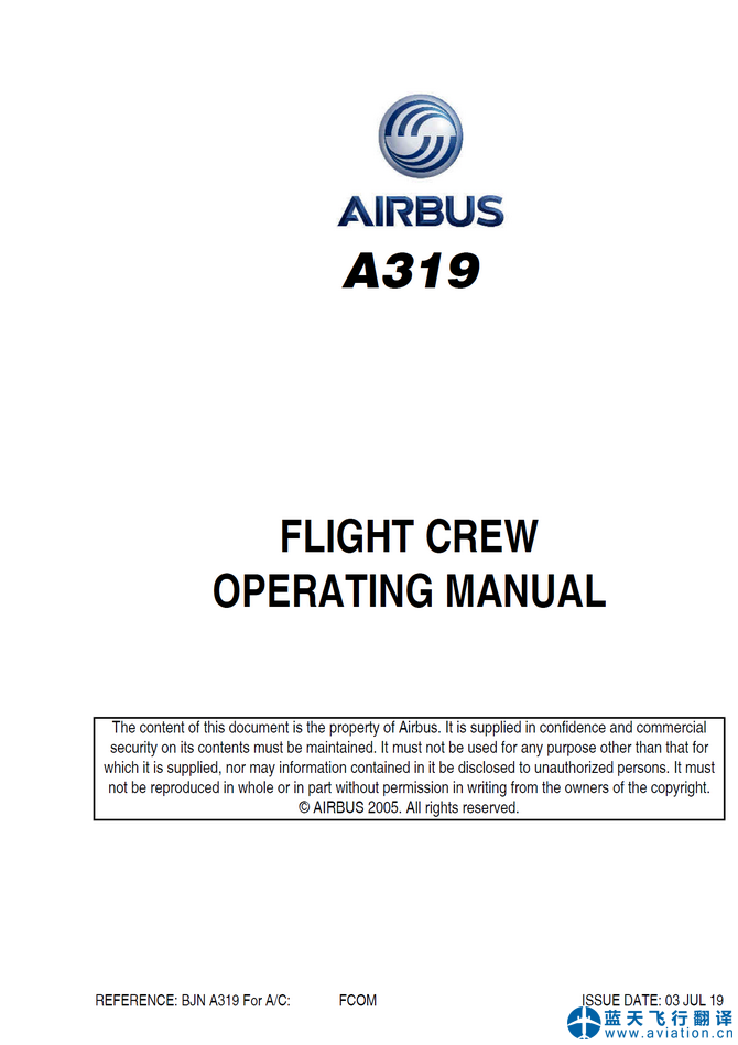 北京藍天飛行翻譯公司承接大型公務機公司的2019年7月3日版本空客公務機ACJ319飛行機組操作手冊(FCOM FLIGHT CREW OPERATING MANUAL)、ACJ319快速檢查單(QRH QUICK REFERENCE HANDBOOK)和ACJ319飛機飛行手冊(AIRPLANE FLIGHT MANUAL)翻譯任務 03 JUL 19 ACJ319 FLIGHT CREW OPERATING MANUAL, QRH QUICK REFERENCE HANDBOOK and AIRPLANE FLIGHT MANUAL Translation