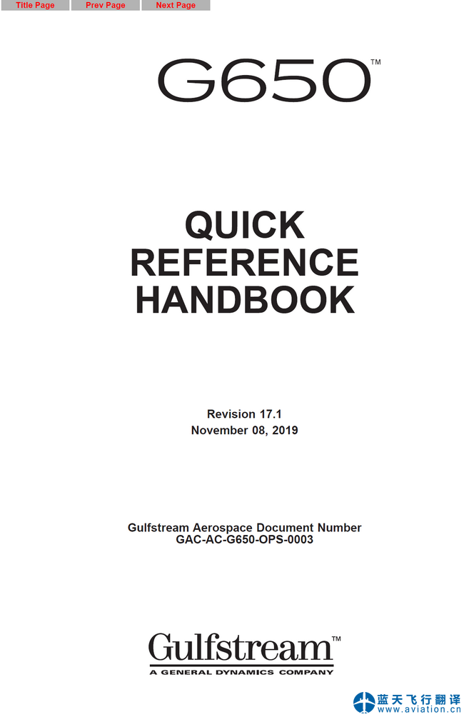 北京藍天飛行翻譯公司本次翻譯的灣流G650快速檢查單(QUICK REFERENCE HANDBOOK)版本為17.1版,修訂日期為2019年11月8日。