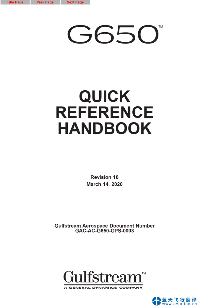 北京藍(lán)天飛行翻譯公司承接大型公務(wù)機(jī)公司的2020年3月14日版本灣流G650快速檢查單翻譯任務(wù) Revision 18 March 14, 2020 Gulfstream G650 QUICK REFERENCE HANDBOOK Translation
