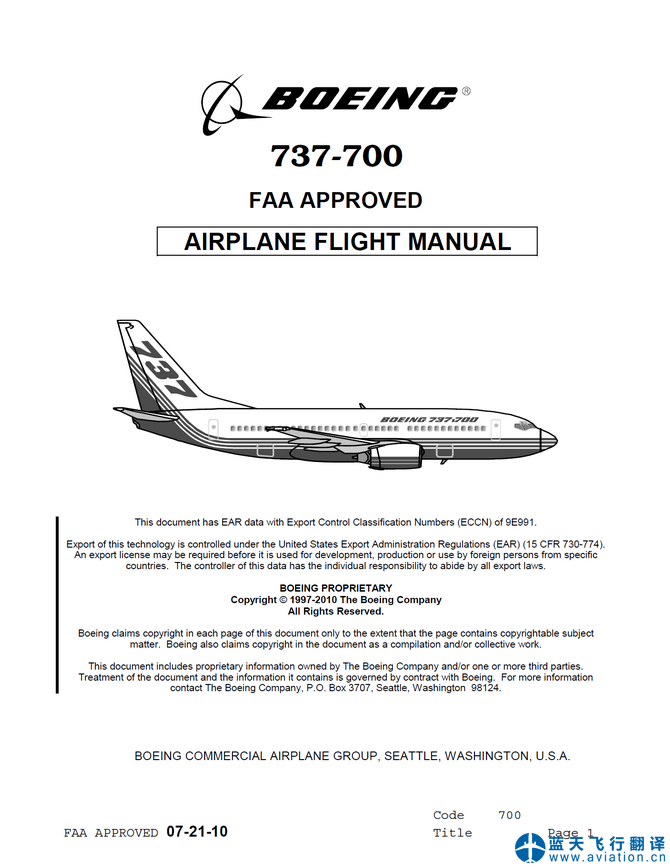 北京藍天飛行翻譯公司承接航空公司波音737-700飛機飛行手冊翻譯任務(wù) 08-05-19 737-700 Airplane Flight Manual Translation