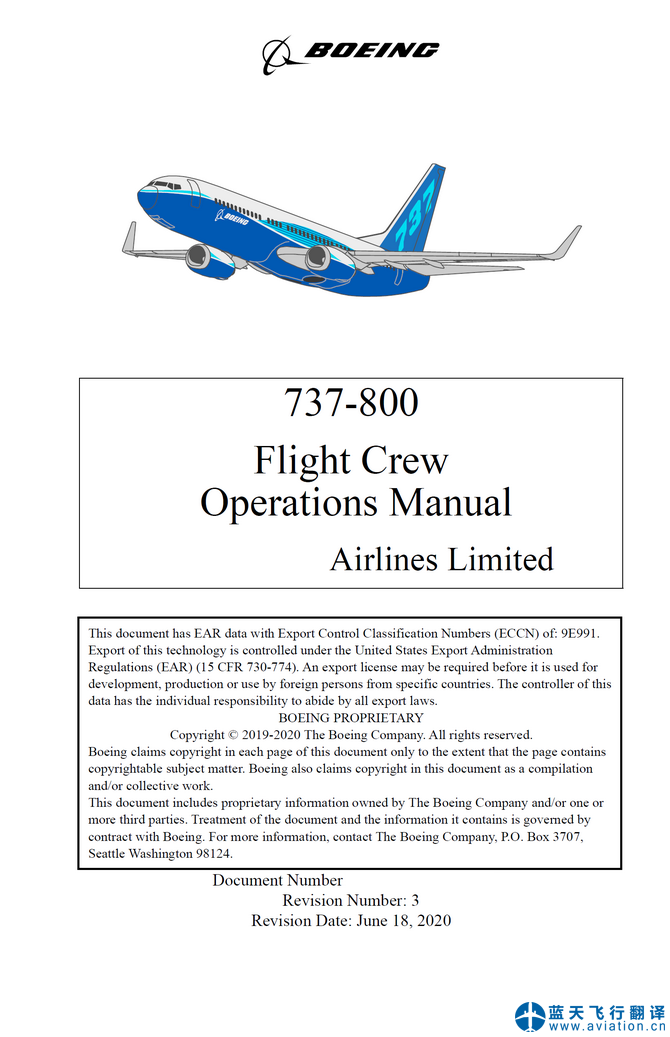 北京藍天飛行翻譯公司本次翻譯的波音737-800飛行機組使用手冊(Flight Crew Operations Manual)和快速檢查單(Quick Reference Handbook)版本日期為2020年6月18日,包含5架波音737-800飛機。