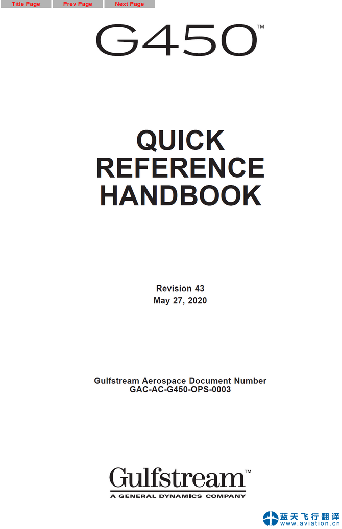 北京藍(lán)天飛行翻譯公司完成大型公務(wù)機(jī)公司的2020年5月27日版本灣流G450快速檢查單翻譯任務(wù) Revision 43 May 27, 2020 G450 QUICK REFERENCE HANDBOOK Translation