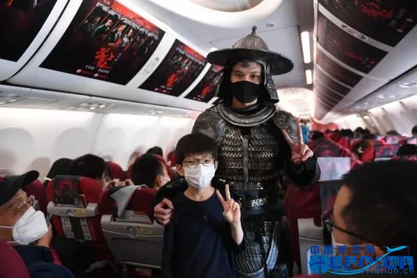 電影角色扮演者在客艙內與小旅客合影 航行期間,客艙廣播為旅客播報電影相關引導互動式廣告,空乘還化身劇中角色與旅客互動,沉浸式營造空中探案氛圍。此外,角色扮演者還身穿禁軍磐龍營副將鄭萬的盔甲驚喜亮相客艙,為互動旅客帶來精美周邊禮品。